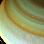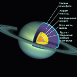 Всякий, кто наблюдал планеты в телескоп, знает, что на поверхности планеты Сатурн, то есть на верхней границе его облачного покрова, заметно мало деталей и контраст их с окружающим фоном невелик. Этим Сатурн отличается от планеты Юпитер, где присутствует множество контрастных деталей в виде темных и светлых полос, волн, узелков, свидетельствующих о значительной активности его атмосферы. Возникает вопрос, действительно ли атмосферная активность Сатурна (например скорость ветра) ниже, чем у Юпитера, или же детали его облачного покрова просто хуже видны с третьей от Солнца планеты из-за большего расстояния (около 1,5 млрд. км.) и более скудного освещения Солнцем (почти в 3,5 раза слабее освещения Юпитера)? "Вояджерам" удалось получить снимки облачного покрова планеты Сатурн, на которых отчетливо запечатлена картина атмосферной циркуляции: десятки облачных поясов, простирающихся вдоль параллелей, а также отдельные вихри. Обнаружен, в частности, аналог Большого Красного Пятна Юпитера, хотя и меньших размеров. Установлено, что скорости ветров на Сатурне даже выше, чем на пятой от Солнца планете: на экваторе 480 м/с, или 1700 км/ч. Число облачных поясов больше, чем на Юпитере, и достигают они более высоких широт. Таким образом, снимки облачности демонстрируют своеобразие атмосферы Cатурна, которая даже активнее юпитерианской. Метерологические явления на Сатурне происходят при более низкой температуре, нежели в земной атмосфере. Поскольку Сатурн в 9,5 раз дальше от Солнца, чем планета Земля, он получает в 9,5 =90 раз меньше тепла. Температура планеты на уровне верхней границы облачного покрова, где давление равно 0,1 атм, составляет всего 85 К, или -188 С. Интересно, что за счет нагревания одним Солнцем даже такой температуры получить нельзя. Рассчет показывает: в недрах Сатурна имеется свой собственный источник тепла, поток от которого в 2,5 раза больше, чем от Солнца. Сумма этих двух потоков и дает наблюдаемую температуру планеты. Космические аппараты подробно исследовали химический состав надоблачной атмосферы Сатурна. В основной она состоит почти на 89% из водорода. На втором месте гелий (около 11% по массе). Отметим, что в атмосфере Юпитера его 19%. Дефицит гелия на Сатурне объясняют гравитационным разделением гелия и водорода в недрах планеты: гелий, который тяжелее, постепенно оседает на большие глубины (что, кстати говоря, высвобождает часть энергии, "подогревающей" Сатурн). Другие газы в атмосфере - метан, аммиак, этан, ацетилен, фосфин - присутствуют в малых количествах. Метан при столь низкой температуре ( около -188 С)находится в основном в капельно-жидком состоянии. Он образует облачный покров Сатурна. Что касается малого контраста деталей, видимых в атмосфере Сатурна, о чем говорилось выше, то причины этого явления пока еще не вполне ясны. Было высказано предположение, что в атмосфере взвешена ослабляющая контраст дымка из мельчайших твердых частиц. Но наблюдения "Вояджера-2" опровергают это: темные полосы на поверхности планеты оставались резкими и ясными до самого края диска Сатурна, тогда как при наличии дымки они бы к краям замутнялись из-за большого количества частиц перед ними. Вопрос, таким образом, не может считаться решенным и требует дальнейшего расследования. Данные, полученные с "Вояджера-1", помогли с большой точностью определить эквато
