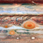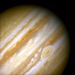 Атмосфера самой большой планеты Солнечной системы представляет собой огромную бушующую часть планеты, состоящую из водорода и гелия. Механизм, приводящий в действие общую циркуляцию на Юпитере, такой же, как и на планете Земля: разность в количестве тепла, получаемого от Солнца на полюсах и экваторе, вызывает возникновение гидродинамических потоков, которые отклоняются в зональном направлении кориолисовой силой. При таком быстром вращении, как у планеты Юпитер, линии тока практически параллельны экватору. Картина усложняется конвек-тивными движениями, которые более интенсивны на границах между гидродинамическими потоками, имеющими разную скорость. Конвективные движения выносят вверх окрашивающее вещество, присутствием которого объясняется слегка красноватый цвет Юпитера. В области темных полос конвективные движения наиболее сильны, и это объясняет их более интенсивную окраску. Так же как и в земной атмосфере, на планете Юпитер могут формироваться циклоны. Оценки показывают, что крупные циклоны, если они образуются в атмосфере Юпитера, могут быть очень устойчивы (время жизни до 100 тысяч лет). Вероятно, Большое Красное пятно является примером такого циклона. Изображения Юпитера, полученные при помощи аппаратуры, установленной на американских космических аппаратах "Пионер-10" и "Пионер-11", показали, что Красное пятно не является единственным образованием подобного типа: имеется несколько устойчивых красных пятен меньшего размера. Спектроскопическими наблюдениями было установлено присутствие в атмосфере самой большой планеты молекулярного водорода, гелия, метана, аммиака, этана, ацетилена и водяного пара. По-видимому, элементный состав атмосферы (и всей планеты в целом) не отличается от солнечного (90% водорода, 9% гелия, 1% более тяжелых элементов). Инфракрасная яркостная температура планеты Юпитер, измеренная в интервале 8 - 14 мк, равна в центре диска 128 - 130К. Если рассмотреть температурные разрезы по центральному меридиану и экватору, можно увидеть, что температура, измеренная на краю диска, ниже, чем в центре. Это можно объяснить следующим образом. На краю диска луч зрения идет наклонно, и эффективный излучающий уровень (то есть уровень, на котором достигается оптическая толщина t=1) расположен в атмосфере на большей высоте, чем в центре диска. Если температура в атмосфере падает с увеличением высоты, то яркость и температура на краю будут несколько меньше. Слой аммиака толщиной в несколько сантиметров (при нормальном давлении) уже практически непрозрачен для инфракрасного излуче-ния в интервале 8 - 14 мк. Отсюда следует, что инфракрасная яркостная температура Юпитера относится к довольно высоким слоям его атмосферы. Распределение интенсивности в полосах СН показывает, что температура облаков значительно больше (160 - 170К) При температуре ниже 170К аммиак (если его количество соответствует спектроскопическим наблюдениям) должен конденсироваться; по-этому предполагается, что облачный покров Юпитера, по крайней мере частично, состоит из аммиака. Метан конденсируется при более низких температурах и в образовании облаков на Юпитере принимать участие не может. Яркостная температура 130К заметно выше, чем равновесная, то есть такая, которую должно иметь тело, светящееся только за счет переизлучения солнечной радиации. Расчеты