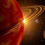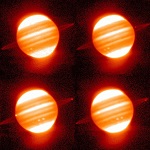 Планета Юпитер преподносит много сюрпризов: он генерирует мощные полярные сияния, сильные радиошумы, возле него межпланетные аппараты наблюдают пылевые бури - потоки мелких твердых частиц, выброшенных в результате электромагнитных процессов в магнитосфере гигантской планеты. Мелкие частицы, которые получают электрический заряд при облучении солнечным ветром, обладают очень интересной динамикой: являясь промежуточным случаем между макро и микротелами, они примерно одинаково реагируют и на гравитационные и на электромагнитные поля. Именно из таких мелких каменных частиц, в основном состоит кольцо Юпитера, открытое в марте 1979 года (косвенное обнаружение кольца в 1974 г. по данным космического аппарата "Пионер" осталось непризнанным). Его главная часть имеет радиус 123-129 тыс. км. Это плоское кольцо около 30км толщиной и очень разреженное - оно отражает лишь несколько тысячных долей процента падающего света. Более слабые пылевые структуры тянутся от главного кольца к поверхности Юпитера и образуют над кольцом толстое гало, простирающееся до ближайших спутников Юпитера. Увидеть кольцо Юпитера с планеты Земля практически невозможно: оно очень тонкое и постоянно повернуто к наблюдателю ребром из-за малого наклона оси вращения планеты Юпитер к плоскости его орбиты. |