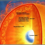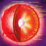 Солнце является сферически симметричным телом, находящимся в равновесии. Знание законов физики, а так же характеристик (массы, радиуса и т.д.) дают нам понять из чего состоит Солнце и особенности его внутреннего строения. Химический состав Солнца: 70% от массы составляет водород, 27% - гелий, другие элементы 2,5% (углерод, кислород, азот, железо, магний и другие). Недра СолнцаСогласно современным расчетам температура в недрах Солнца достигает 15 - 20 млн. градусов цельсия, плотность 1,5гр на см кубических. Ученые пологают, что источник энергии Солнца - ядерная реакция, протекающая глубоко под поверхностью, которая поддерживает высокую температуру светила. Солнце вырабатывает огромное кол-во энергии, примерно 1,92 эрг/г/сек. Глубоко под поверхностью Солнца водород превращается в гелий в следствии ядерной реакции с сопутсвующим выделением энергии. Ученым известны два вида термоядерных реакций протекающих внутри звезд: водородный цикл и углеродный цикл. На Солнце преимущественно протекает водородный цик, который можно разбить на три этапа: первый - ядра водорода превращаются в ядра дейтерия (изотоп водорода), вторая - ядра водорода превращаются в ядра неустойчивого изотопа гелия, третья - связывает продукты первой и второй реакции с образованием устойчивого изотопа гелия. Выход тепла из недр Солнца совершается путем поглащения электромагнитного излучения, приходящего снизу и его дальнейшего переизлучения. Ближе к поверхности солнца излучаемая из недр энергия переносится преимущественно с помощью конвекции - перемешивании вещетсва (теплые потоки вещества поднимаются ближе к поверхности, холодные же опускаются). Эта зона - зона конвекции залегает на глубине около 10% солнечного диаметра и доходит почти до поверхности звезды. Атмосфера СолнцаВыше зоны конвекции начанается атмосфера Солнца (фотосфера и хромосфера), в ней перенос энергии снова происходит с помощью излучения. Солнечная корона - верхняя часть атмосферы Солнца, в ней основную долю энергии уносит Солнечный ветер - потоки вещества испускаемые Солнцем в космическое пространство. Температура каждого из слоев Солнца более или менее постоянна, т.к. они находятся в энергетическом равновесии (сколько энергии слой теряет в единицу времени, столько же он и преобретает). Cветимость СолнцаВ полдень Солнце создает освещенность на поверхности нашей планеты около 100 тыс.лк, что равно свету. Если не брать в расчет атмосферу Земли, то на орбите нашей планеты освещенность 127 тысяч.лк. Солнечная постоянная - величина энергии, получаемая поверхностью площадью 1 см. квадратный за 60 секунд на расстоянии 1 астрономической единицы (растояние от Солнца до Земли). Края Солнечного диска заметно менее яркии нежели центр, их яркость всего 20% от яркости цетра диска. Солнце имеет четкие границы из-за того, что на границе диска яркость падает в 100 раз за менее чем одну секунду дуги. |